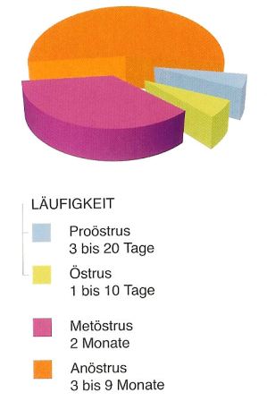 Hündinnen werden durchschnittlich zweimal pro Jahr läufig. Die Dauer der Läufigkeit ist sehr variabel. Sie kann nur etwa 10 Tage, aber auch bis zu drei oder viel Wochen anhalten. Die Phase der vollständigen sexuellen Ruhe zwischen zwei Läufigkeiten dauert also vergleichsweise lang.