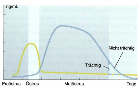 Bei der trächtigen Hündin fällt der Progesteronspiegel etwa 12 - 24 Stunden vor der Geburt schlagartig ab. Interessanterweise sinkt der Progesteronspiegel bei einer nicht trächtigen Hündin deutlich langsamer ab. So entsteht die kuriose Situation, dass eine nicht trächtige Hündin das Schwangerschaftshormon Progesteron über einen längeren Zeitraum bildet als eine trächtige Hündin.