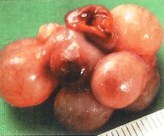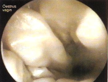 Endoskopisches Erscheinungsbild der Vaginalschleimhaut. Im Verlauf der Läufigkeit bei der Hündin. Zu Beginn der Läufigkeit ist die Schleimhaut sehr ödematös (geschwollen), rötlich und glänzend (oben) später, zum Östrus hin, wird sie faltenreich und blass.