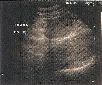 Beispiel einer Ultraschall- untersuchung des Eierstocks bei der Hündin. Sehr gut zu erkennen sind die Follikel als dunklere und runde Strukturen im Eierstock