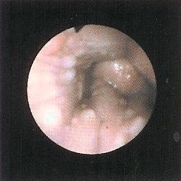 Endoskopisches Erscheinungsbild einer Vaginitis (Scheidenentzündung). Oben erkennt man eine granulomatöse Vaginitis, gekennzeichnet durch kleine Knötchen an der Schleimhautoberfläche.