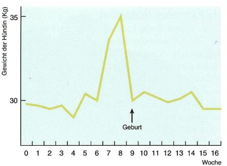 Beispiel für die Gewichtsentwicklung bei trächtigen Hündinnen. Die Gewichtszunahme findet hauptsächlich in den letzten drei Trächtigkeitswochen statt, man spricht hier auch von Graviditätsanabolismus.