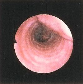 Endoskopisches Erscheinungsbild einer Vaginitis (Scheidenentzündung). Oben erkennt man eine granulomatöse Vaginitis, gekennzeichnet durch kleine Knötchen an der Schleimhautoberfläche.